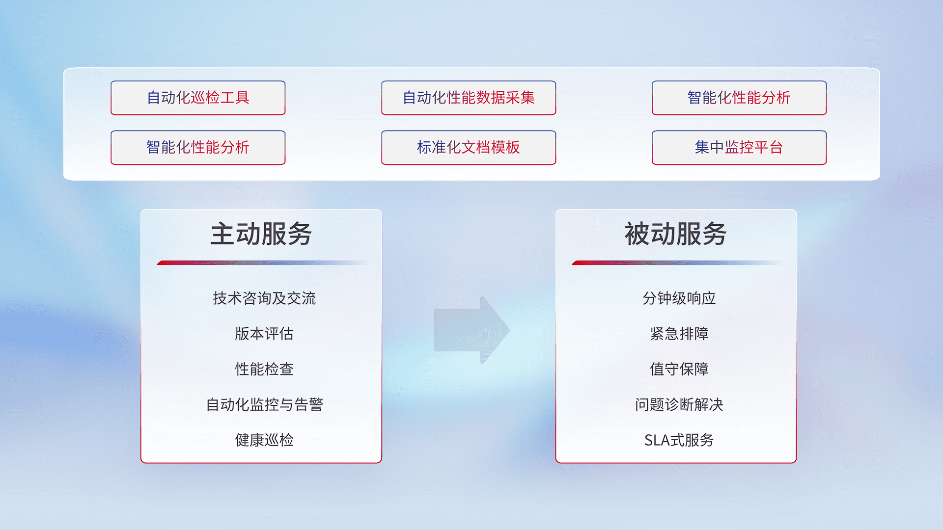 智能化工具和标准化文档,,,,保障服务质量,,提供主动服务(包含技术咨询、、、版本评估、、、、性能检查、、、自动化监控与告警、、、、健康巡检)和被动服务包含(分钟级响应、、紧急排障、、、值守保障、、、、问题诊断解决、、、SLA服务)。。。。